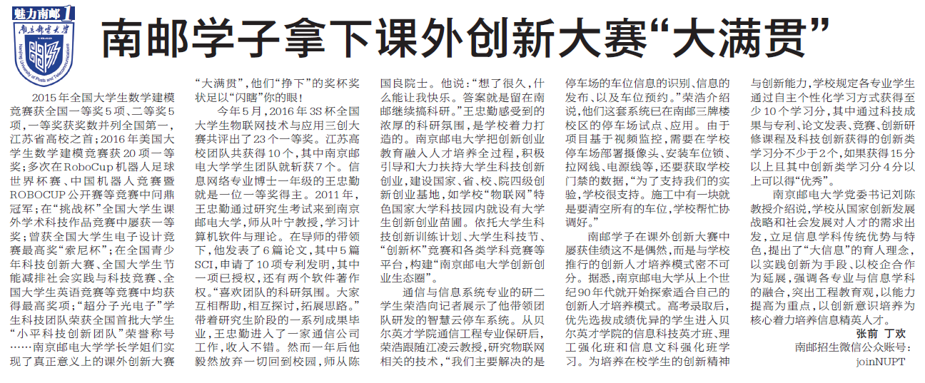 【扬子晚报】南邮学子拿下课外创新大赛“大满贯”