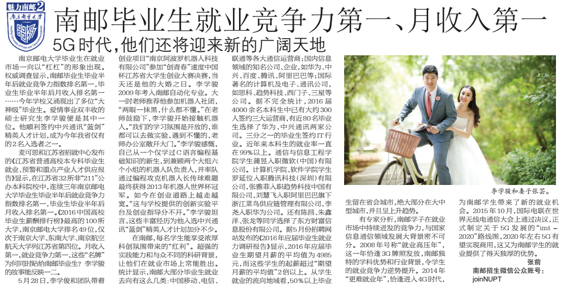 【扬子晚报】南邮毕业生就业竞争力第一,月收入第一