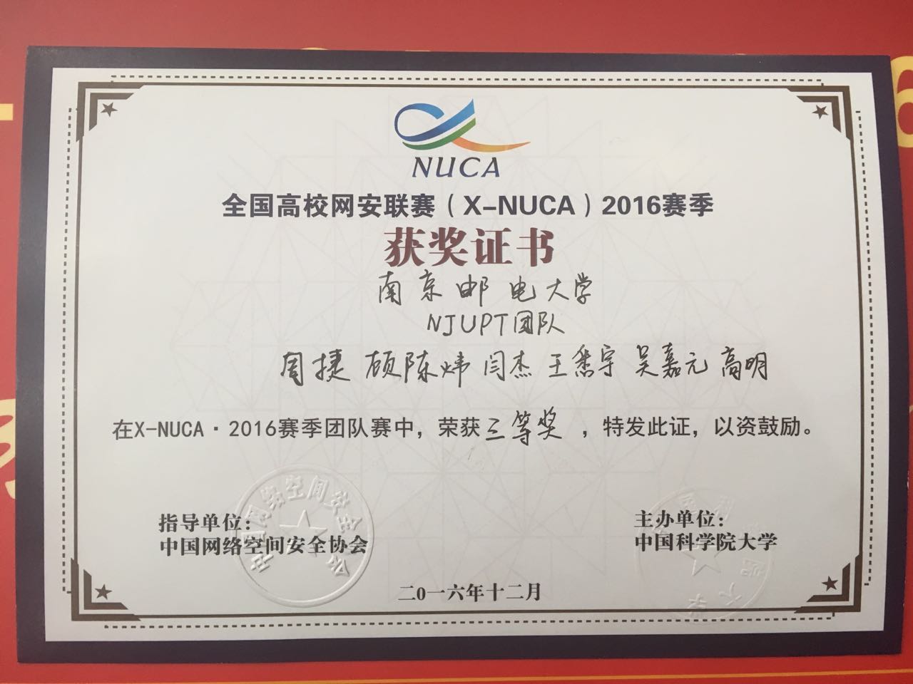 12月21日,全国高校网安联赛(X-NUCA 2016)总决赛落下帷幕,我校计算机学院、软件学院孙国梓老师指导,周捷、王悉宇、闫杰、吴嘉元、顾陈炜等同学组成的NJUPT代表队获三等奖,分数排名第八。