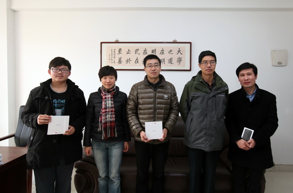 近日,南京邮电大学校园卡封面设计大赛颁奖。宣传部部长徐雷、信息化建设与管理办公室主任顾亦然分别为一等奖获得者张丰、二等奖获得者刘佳乐、李荣志颁发奖品。