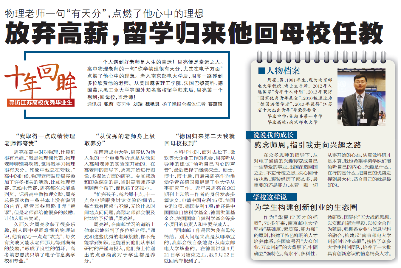 【扬子晚报】放弃高薪,留学归来他回母校任教