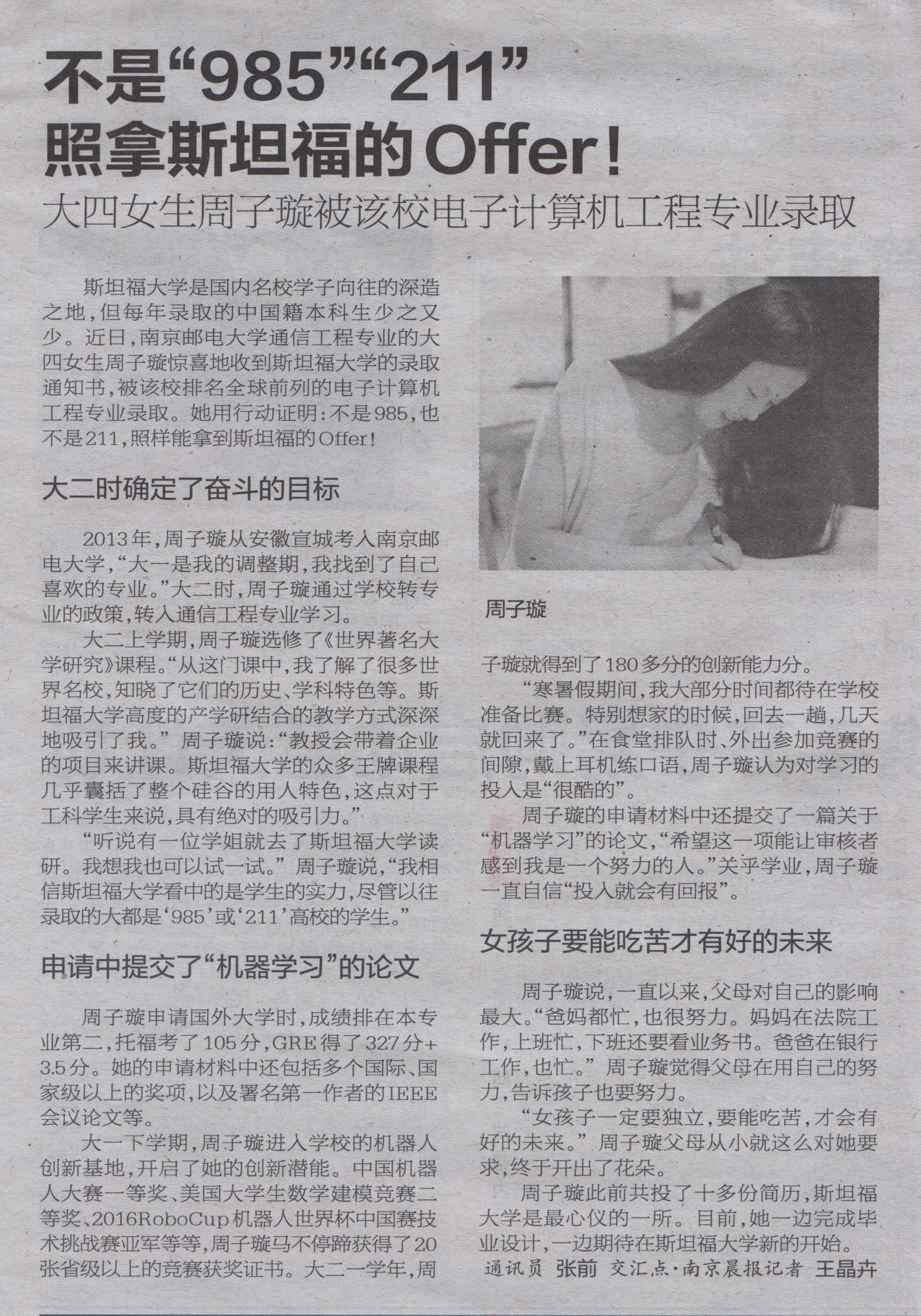 【南京晨报】不是“985”“211” 照拿斯坦福的Offer!