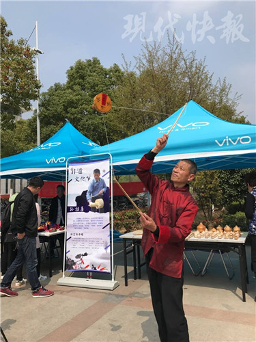 在陈耀剪纸展位的隔壁,市级非遗传承人孙桂喜正在教学生们如何抖空竹。嗡嗡地声响吸引很多学生前来观赏。孙桂喜说,他已经抖了53年空竹了。“我今年61岁了,从8岁开始,就学这门祖上传下来的手艺。”他拿着一个空竹告诉现代快报记者,自己这么多年,最擅长做空竹。“做一个空竹,有78道工序,需要用到毛竹、木板、糖树等材料。从采购竹子,到把竹子劈成一段段,然后浸泡,再上车床加工……”