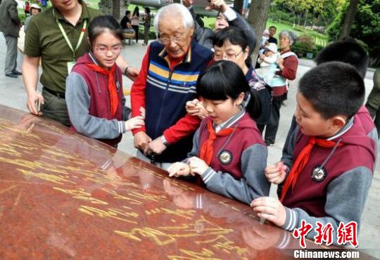 老红军与小学生在红军广场朗读毛泽东的诗词《七律·长征》。 沈金霞 摄