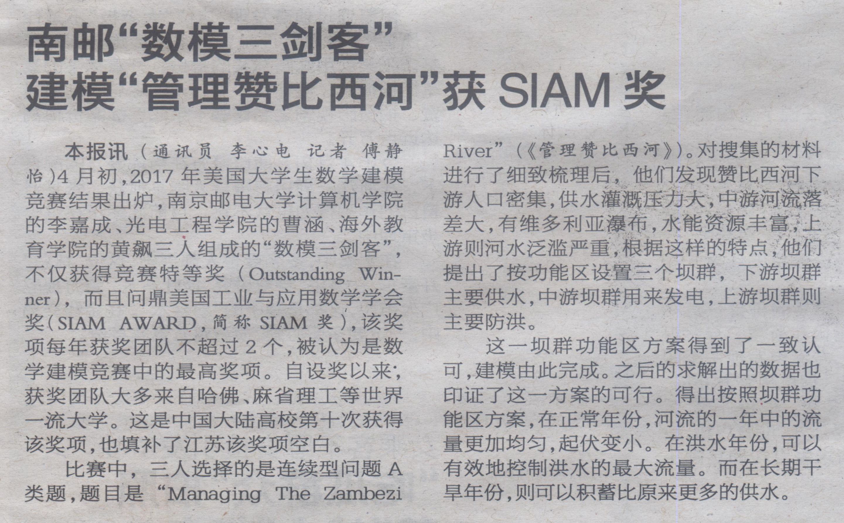 【东方卫报】南邮“数模三剑客”建模“管理赞比西河”获SIAM奖
