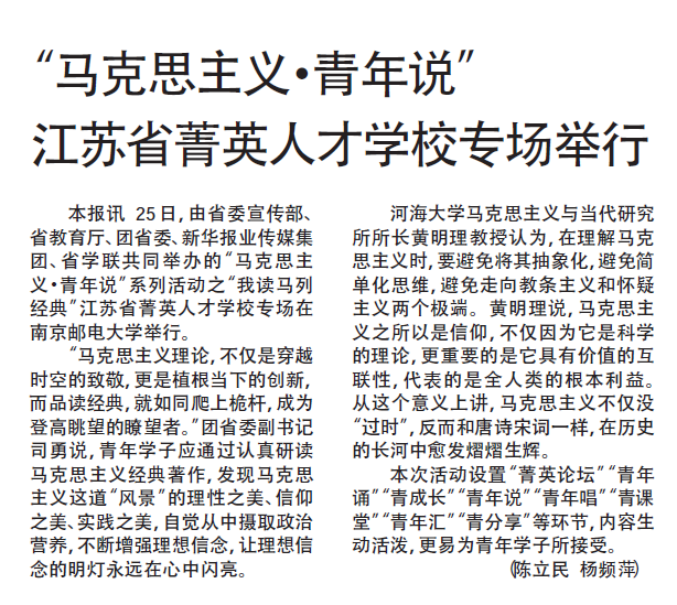 【新华日报】“马克思主义·青年说”江苏省菁英人才学校专场举行