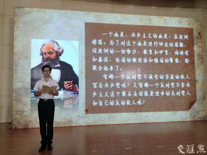点睛:《共产党宣言》是科学社会主义惊天动地的出生证,是阐述资本主义和共产主义最通俗的读本,它是高深与通俗、冷静与热情的有机结合,也是学者头脑与战士精神最完美的统一。聆听学员代表张浩铭同学铿锵有力朗读,仿佛置身于马克思撰写《共产党宣言》时的现场,切身感受到他那满腔愤怒而又对革命胜利坚定的信心。