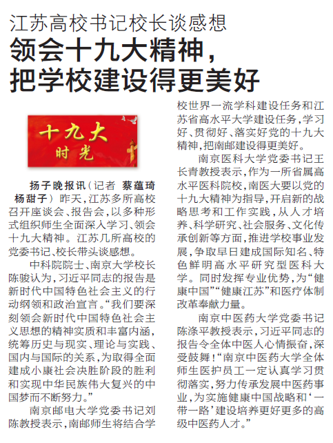 【扬子晚报】领会十九大精神, 把学校建设得更美好