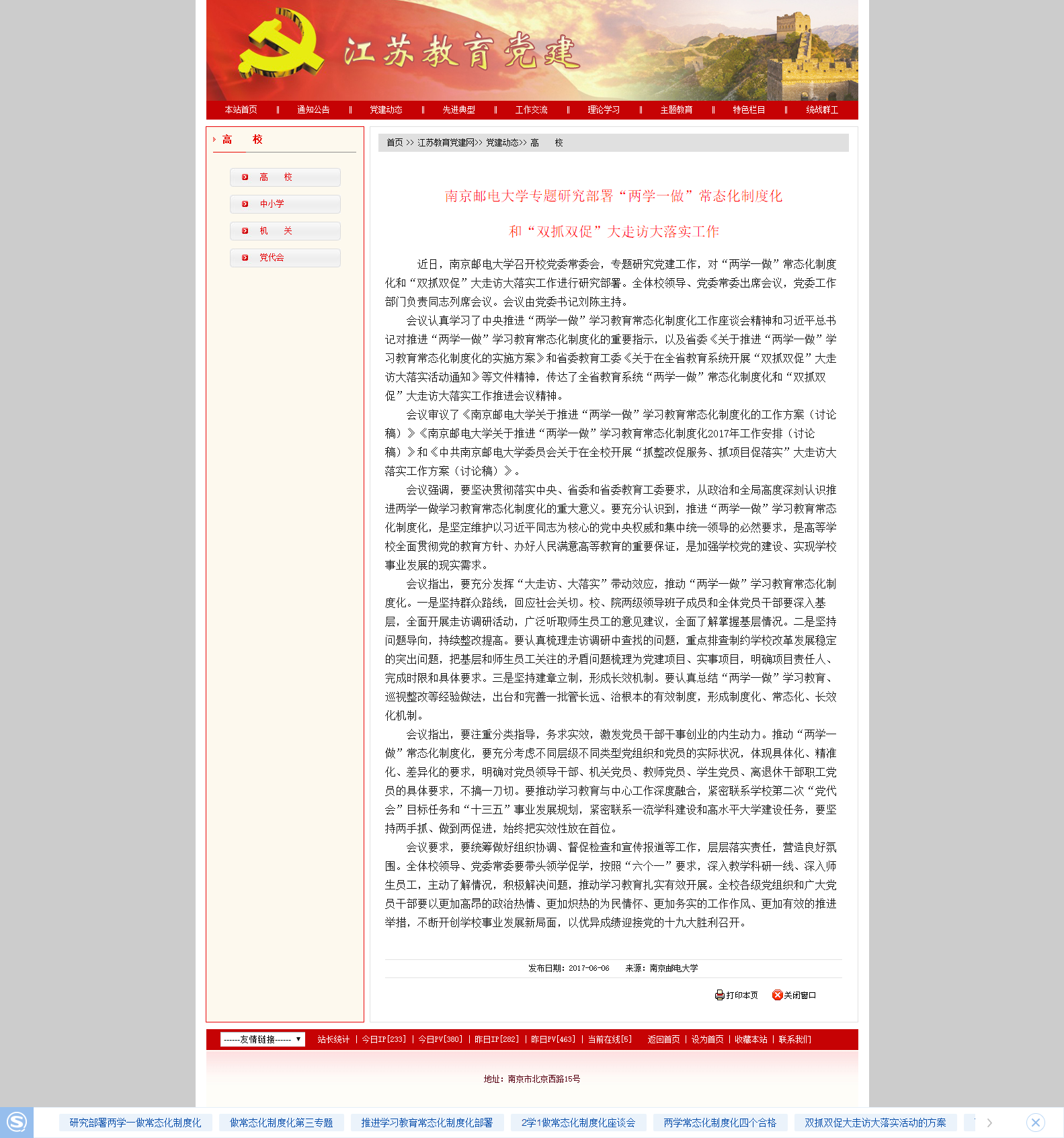 【江苏教育党建】南京邮电大学专题研究部署“两学一做”常态化制度化和“双抓双促”大走访大落实工作