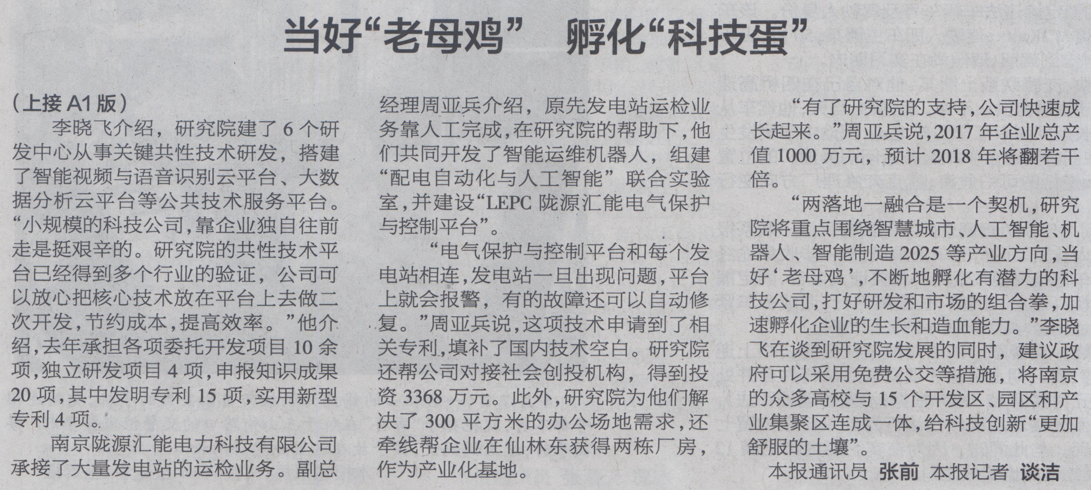 【南京日报】头版:当好“老母鸡” 孵化“科技蛋”