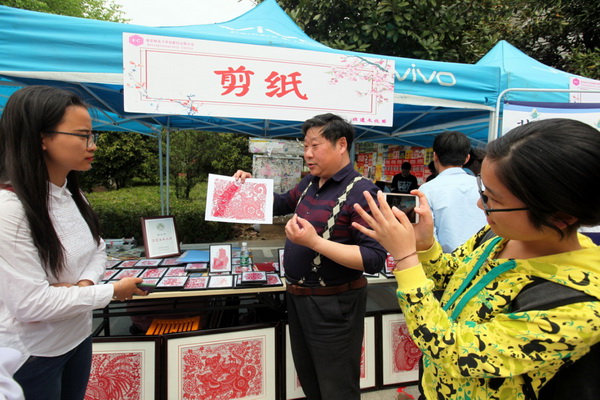 4月11日 ,南京邮电大学第四届非遗文化节在仙林校区南二外场举行。本次活动邀请到非遗传承人、中国民间剪纸艺术家、国家高级工艺美术史陈耀,市级非遗传承人、从事抖空竹表演多年的孙光辉,南京市非物质文化遗产(布艺)代表性传承人高勇,扎灯大师曹真荣的女儿曹红,天然染色手工艺术王建超等非遗大师带来了精美的非遗作品,并现场展示了各自精妙绝活。