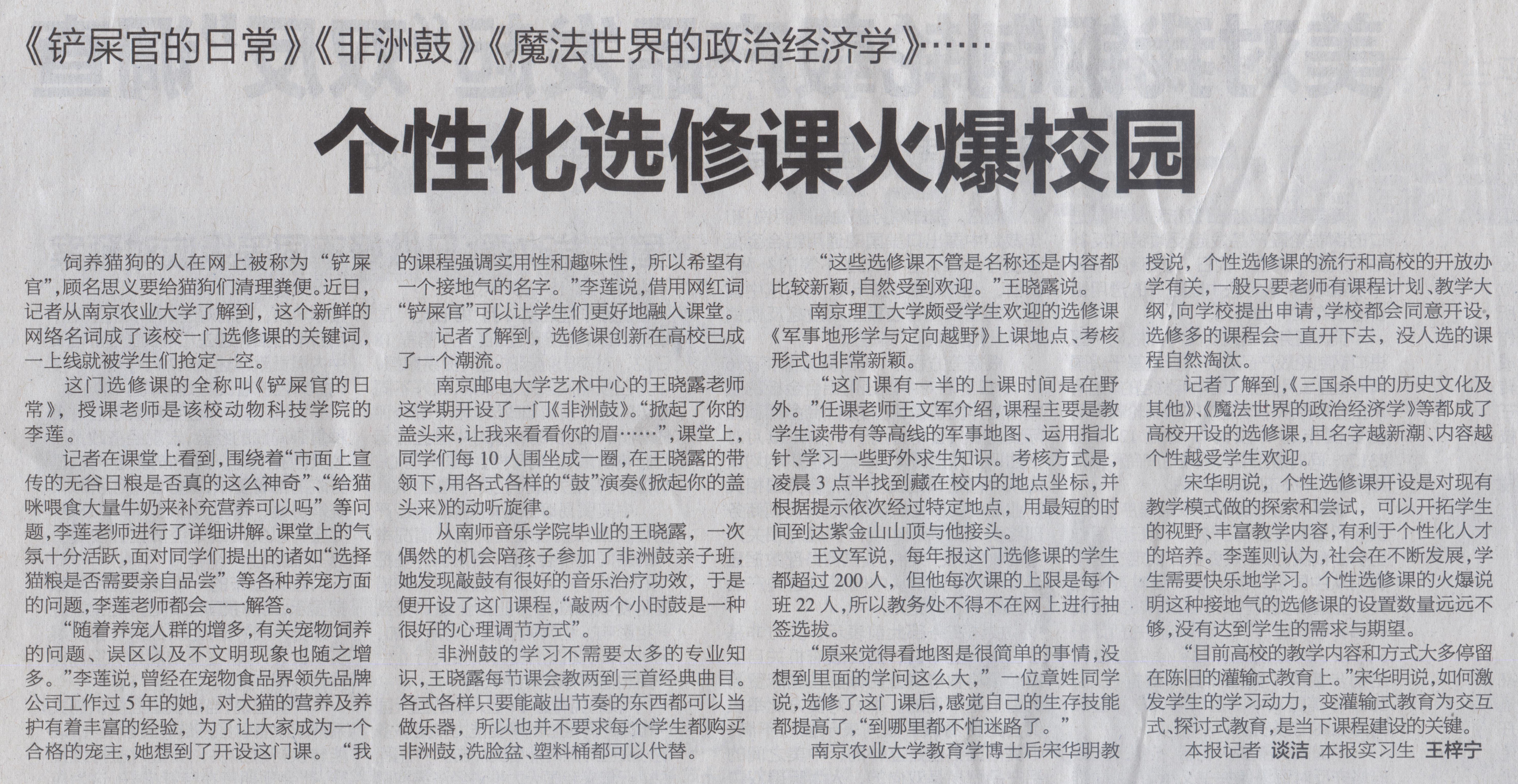 【南京日报】个性化选修课火爆校园