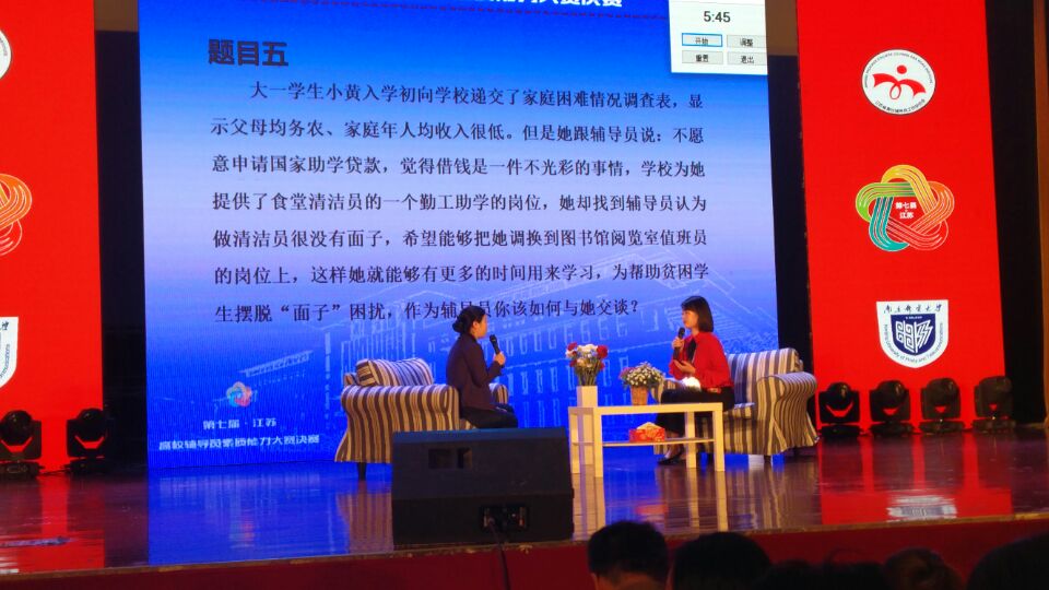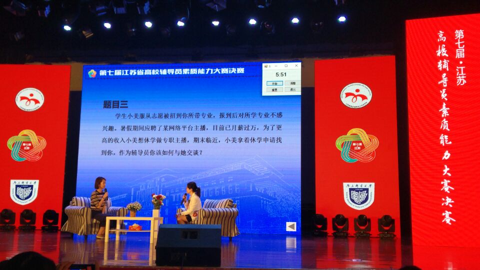 交汇点讯 5月17日,由省教育厅主办的第七届江苏高校辅导员素质能力大赛决赛在南京邮电大学举行。来自全省30所高校的30名优秀辅导员,通过初赛、复赛两轮选拔,从全省近万名辅导员中脱颖而出入围决赛。现场PK分为笔试、案例分析、谈心谈话、理论宣讲等比赛项目。