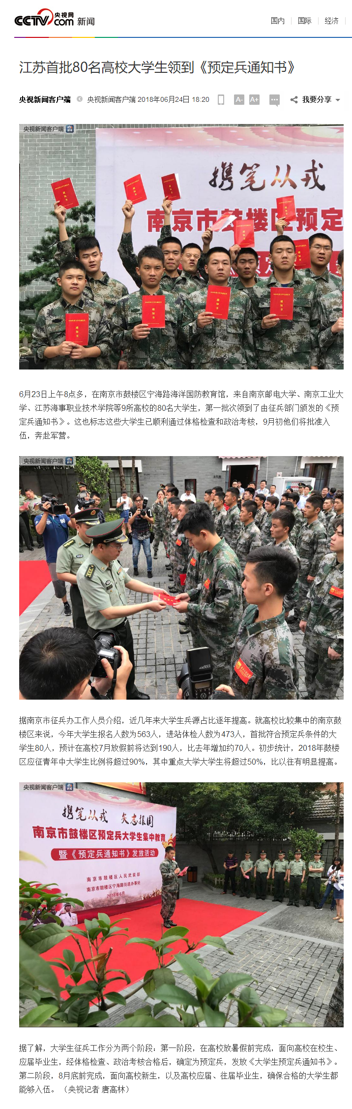 【央视网】江苏首批80名高校大学生领到《预定兵通知书》