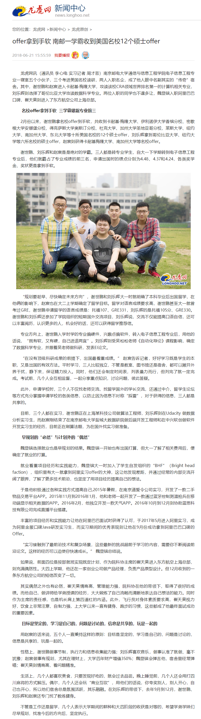 【龙虎网】offer拿到手软 南邮一学霸收到美国名校12个硕士offer
