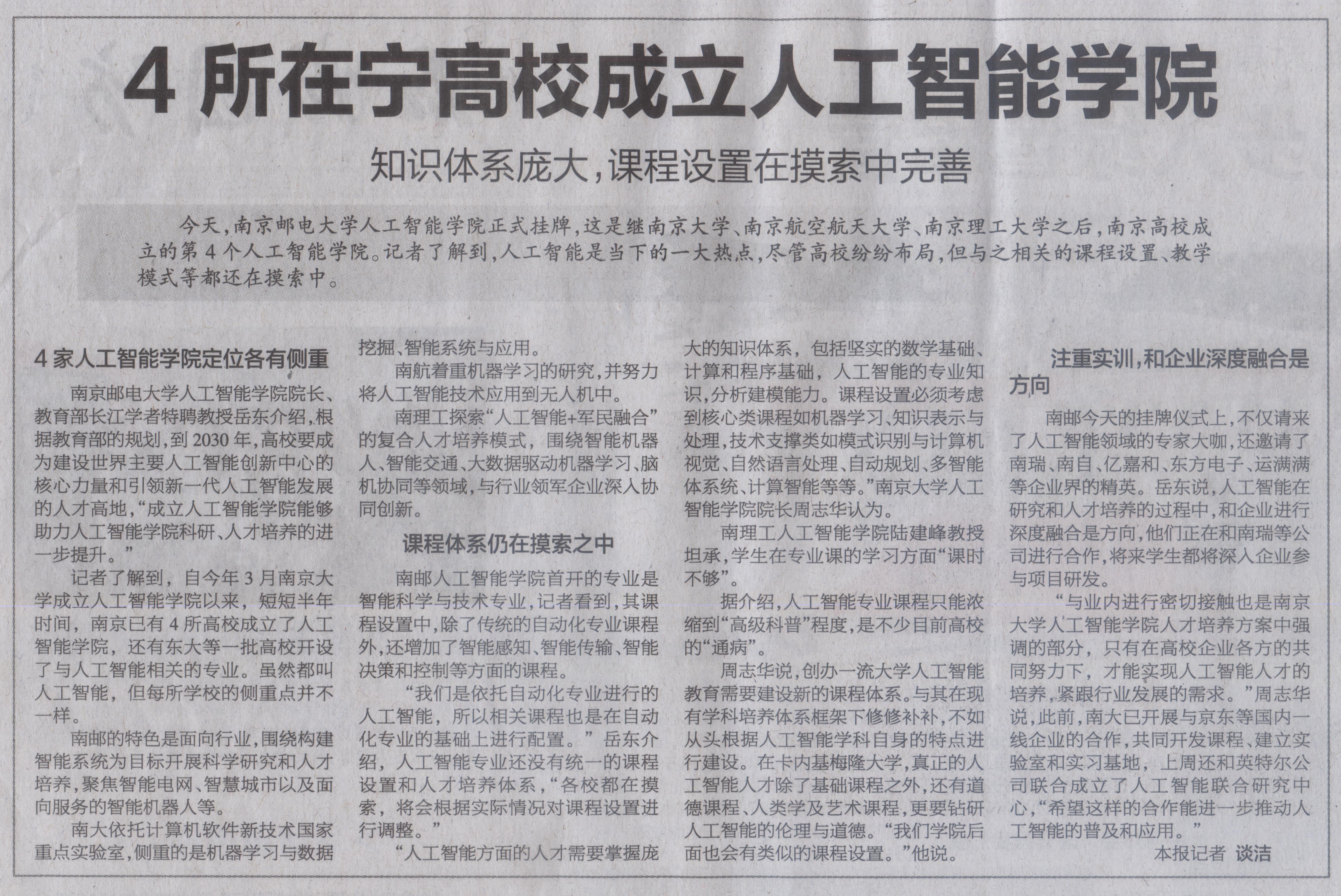 【南京日报】4所在宁高校成立人工智能学院