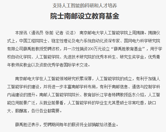 【南京日报】院士南邮设立教育基金