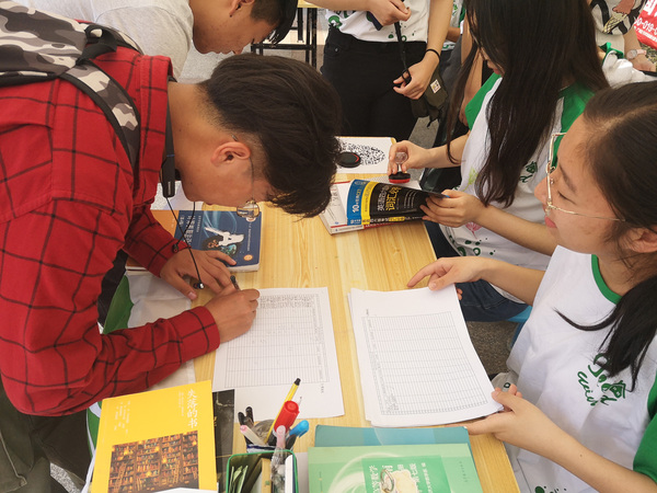 第一次户外活动是赠送给有需要的学弟学妹,第二次户外活动将书籍赠送给新入校的大一新生,同时将部分教材与专业书籍捐赠到图书馆。让爱心持续传递,让书籍循环利用,“绿”与“爱”的融合将会是新生入校最震撼的“开学第一课”。(图:在校师生正在登记免费领取图书)