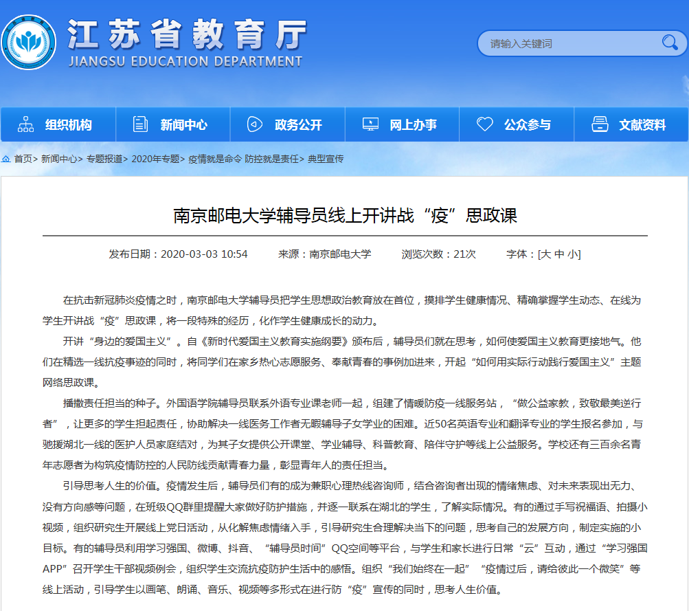 【江苏教育】南京邮电大学辅导员线上开讲战“疫”思政课