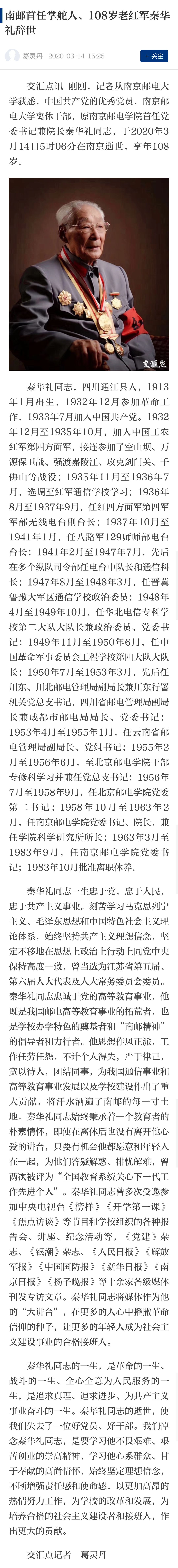 【交汇点】南邮首任掌舵人、108岁老红军秦华礼辞世