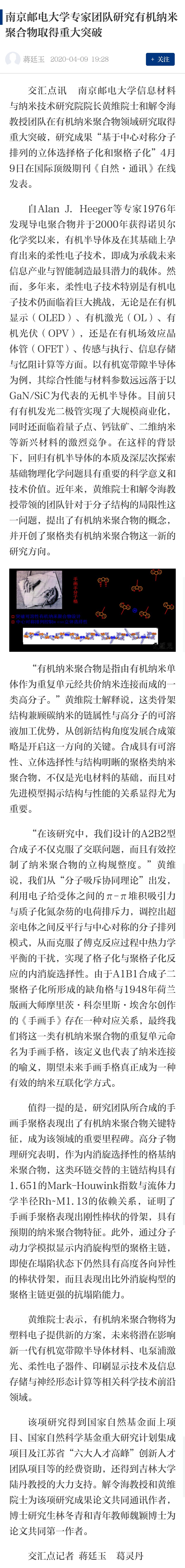 【交汇点】南京邮电大学专家团队研究有机纳米聚合物取得重大突破
