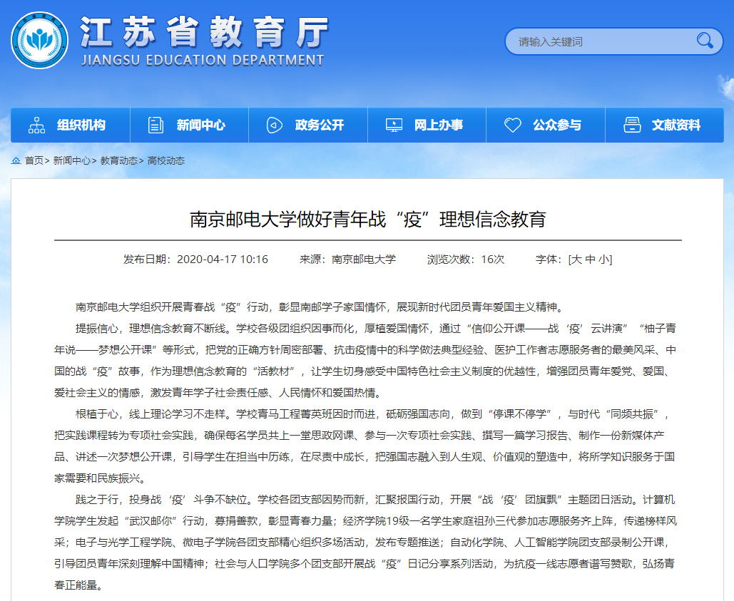 【江苏教育】南京邮电大学做好青年战“疫”理想信念教育