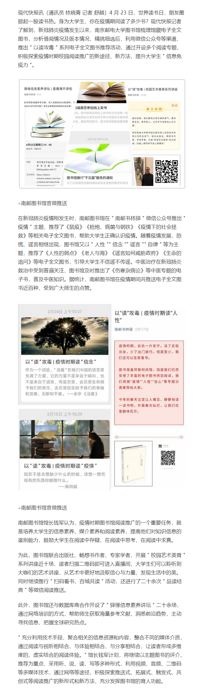 【现代快报网】疫情期间推送电子书近百种!南京一高校“以读攻毒”系列获师生点赞