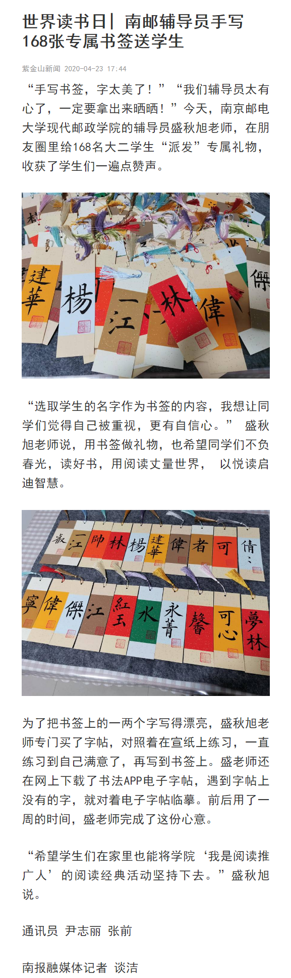 【紫金山APP】南邮辅导员手写168张专属书签送学生