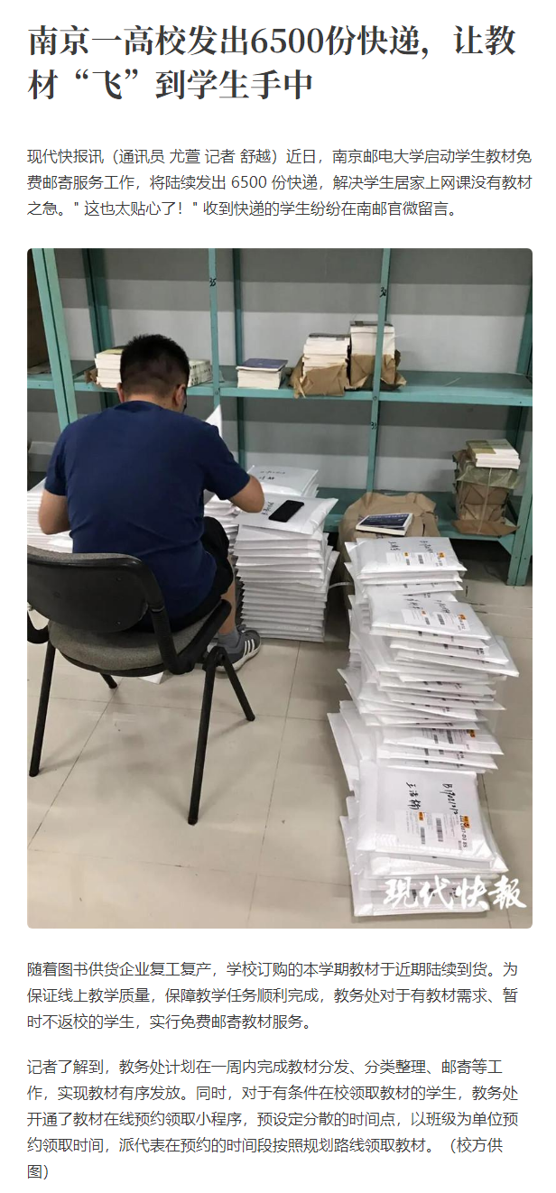 【现代快报网】南京一高校发出6500份快递,让教材“飞”到学生手中