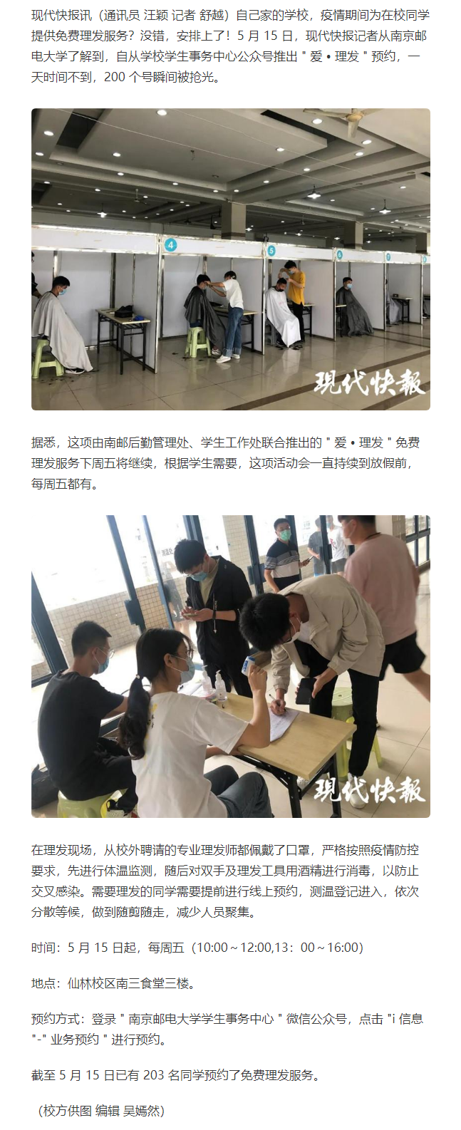 【现代快报网】Tony老师来了!江苏这所高校为在校生免费提供理发服务
