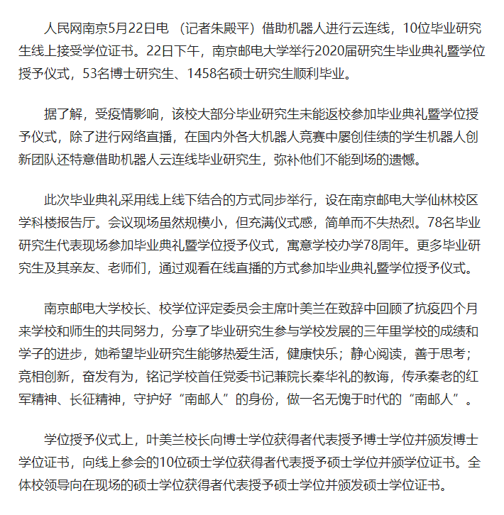【人民网】南京邮电大学举办云毕业典礼 机器人代领学位证