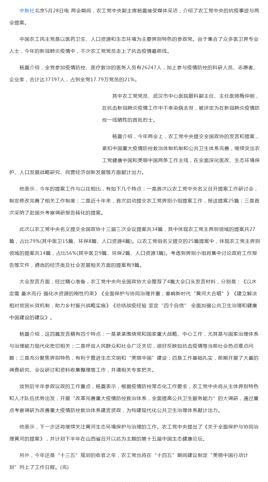 【中国新闻网】农工党中央副主席杨震:继续突出农工党“健康中国”“美丽中国”工作主线