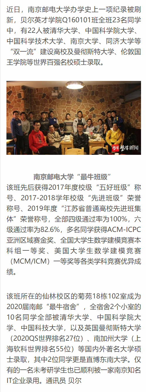 【扬子晚报客户端】高校“最牛班级”来啦,有多牛?23人中22人被国内外名校录取