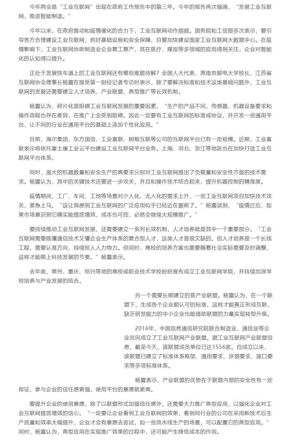 【第一财经网】全国人大代表杨震:工业互联网建设还需解答这些难题