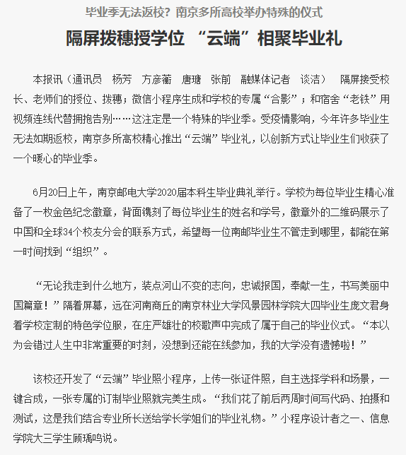 【南京日报】隔屏拨穗授学位 “云端”相聚毕业礼