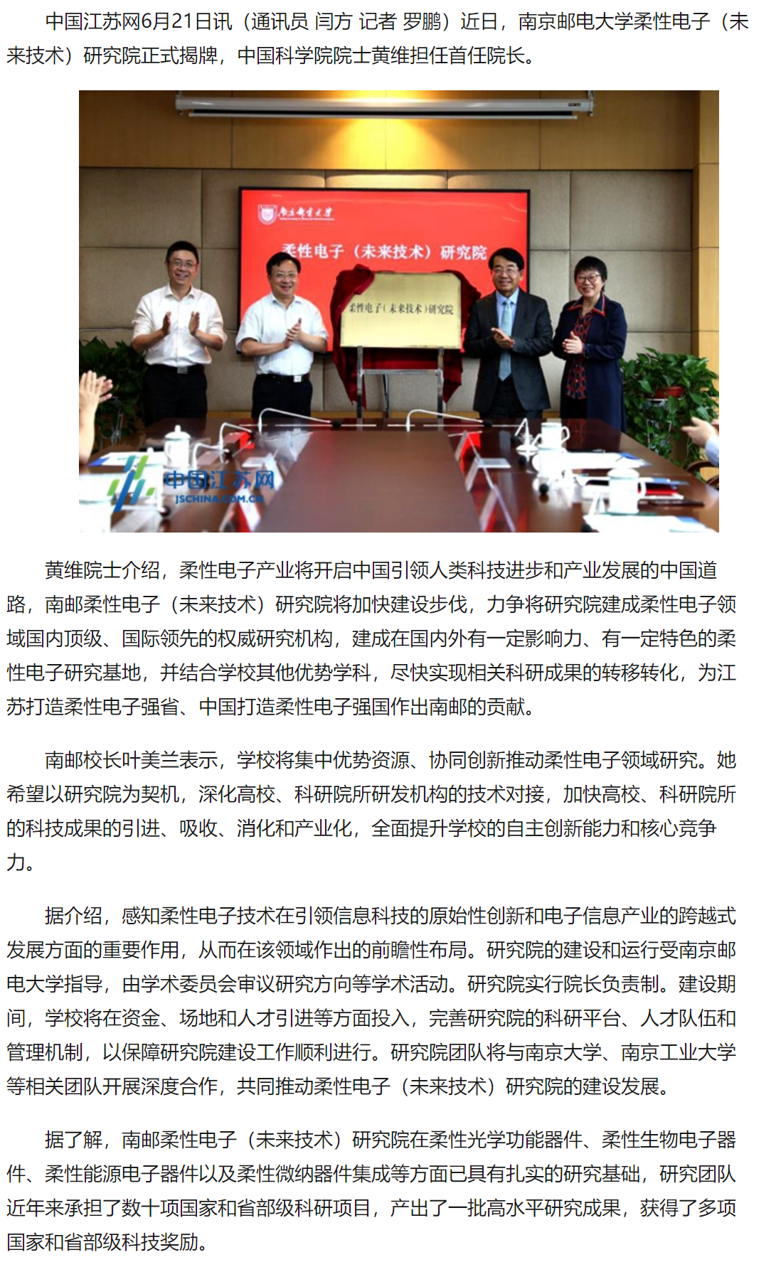 【中国江苏网】南邮成立柔性电子(未来技术)研究院