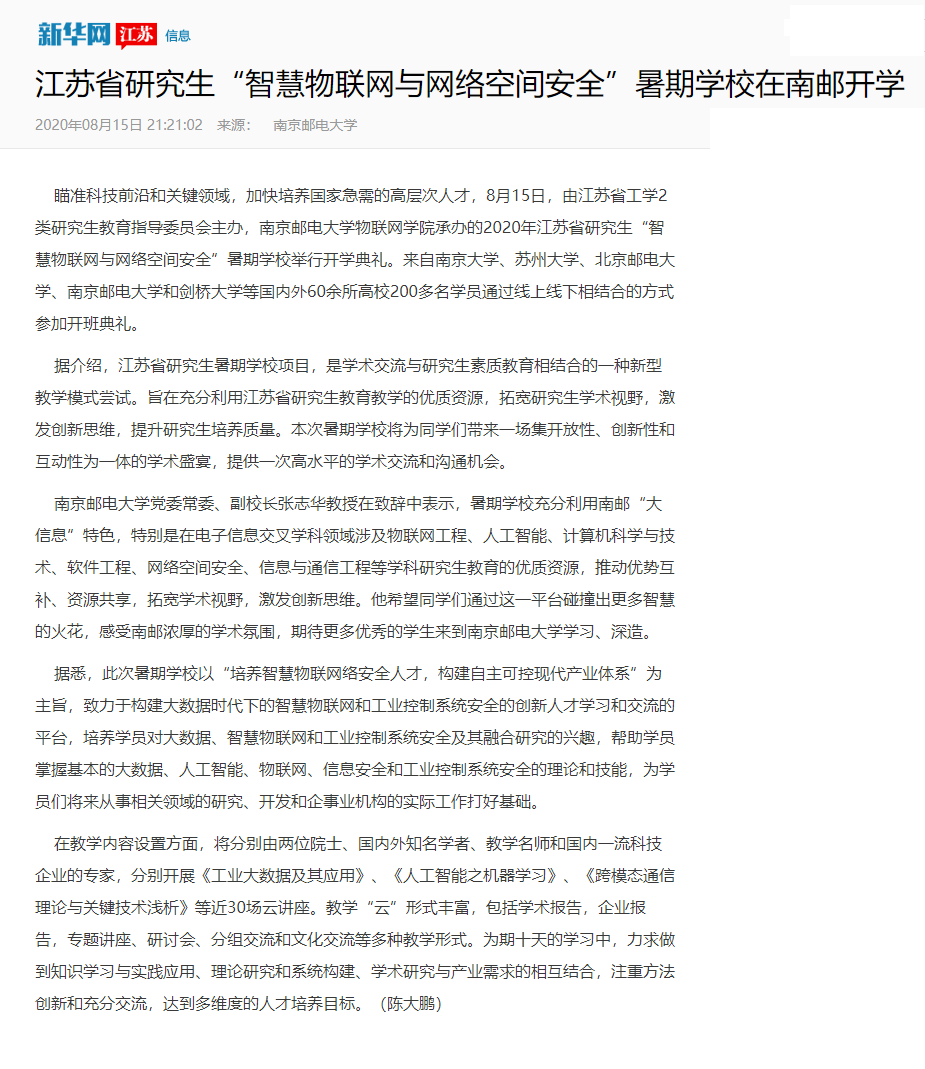 【新华网】江苏省研究生“智慧物联网与网络空间安全”暑期学校在南邮开学