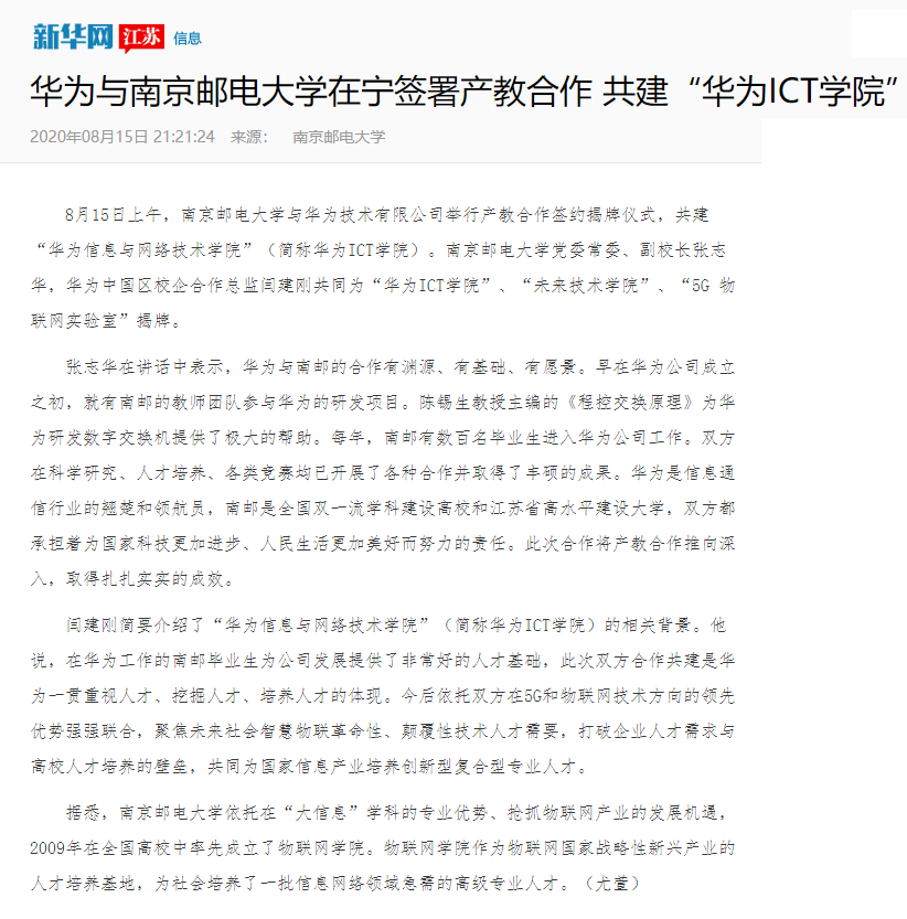 【新华网】华为与南京邮电大学在宁签署产教合作 共建“华为ICT学院”