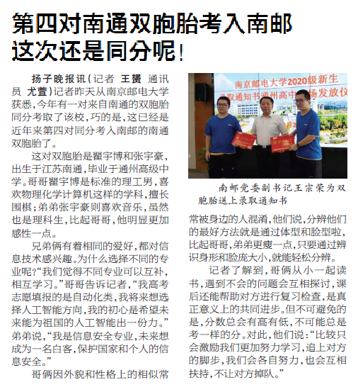 【扬子晚报】第四对南通双胞胎考入南邮 这次还是同分呢!