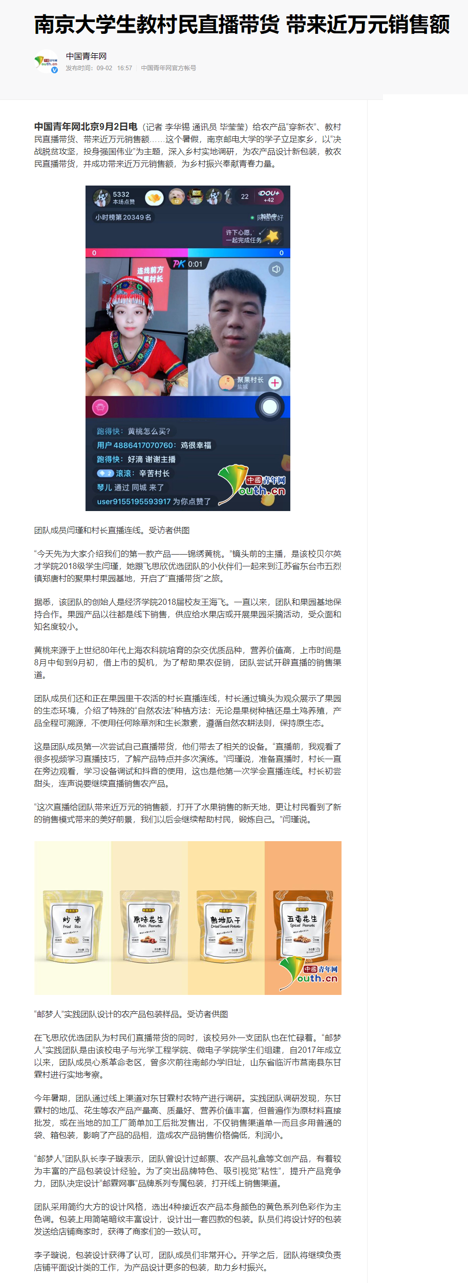 【中国青年网】南京大学生教村民直播带货 带来近万元销售额