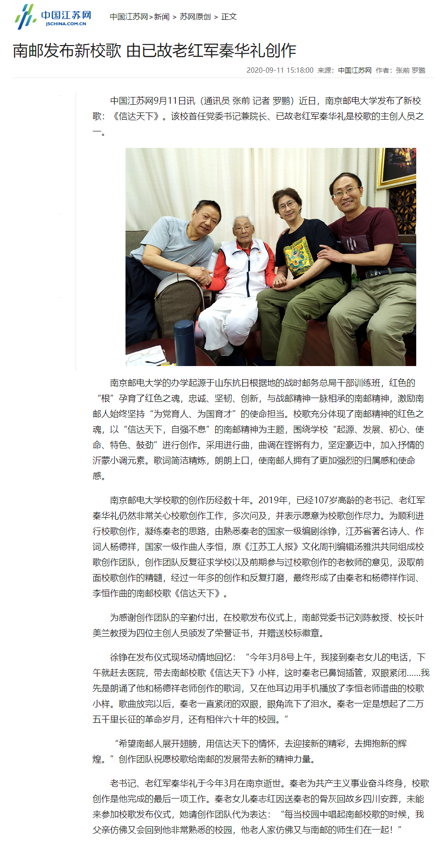 【中国江苏网】南邮发布新校歌 由已故老红军秦华礼创作