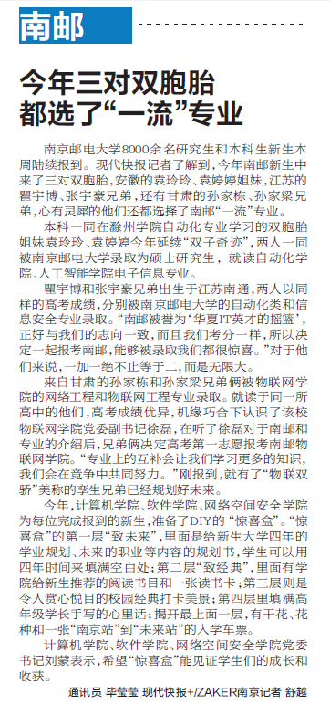 【现代快报】南邮:今年三对双胞胎都选了“一流”专业