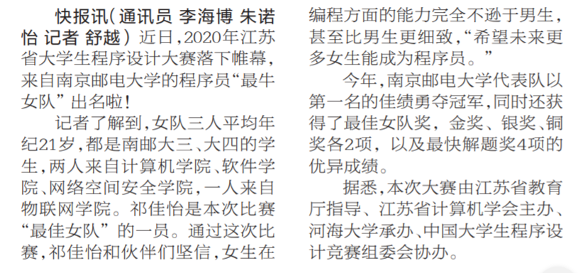 【现代快报】江苏大学生程序设计大赛“最佳女队”来自南邮