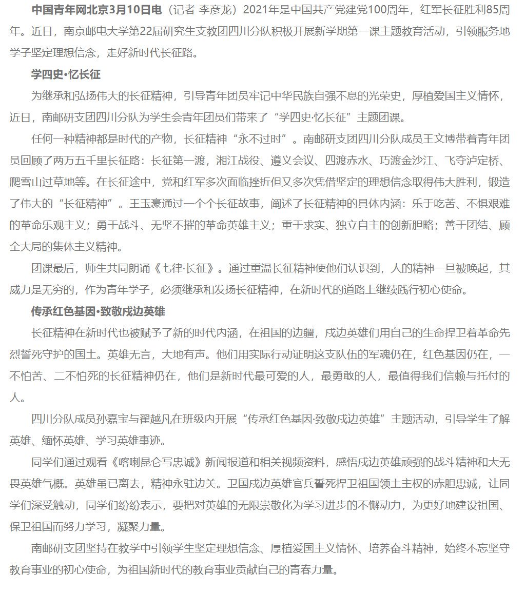 【中国青年网】南邮研支团在四川开学第一课学四史忆长征