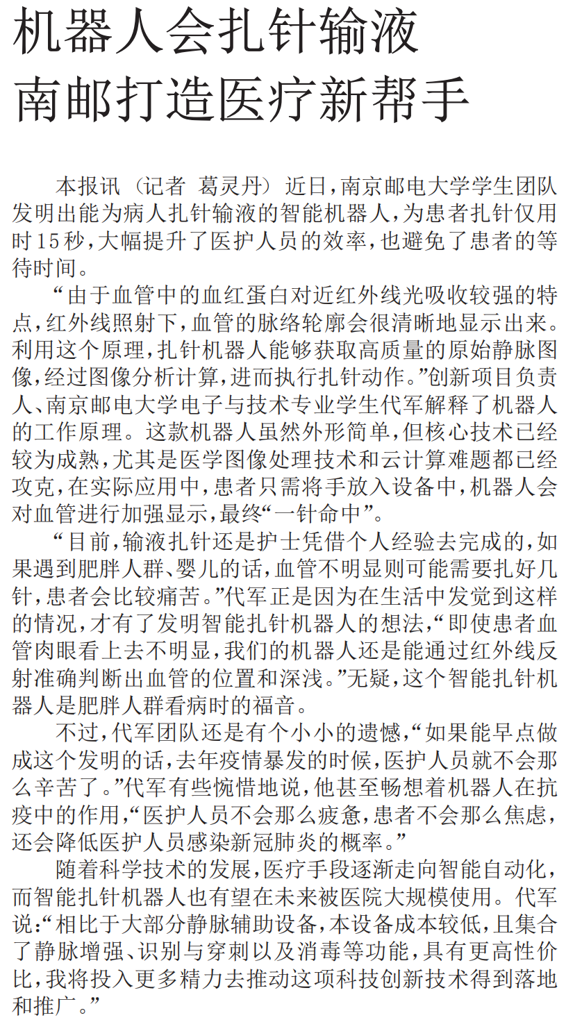 《新华日报》机器人会扎针输液 南邮打造医疗新帮手