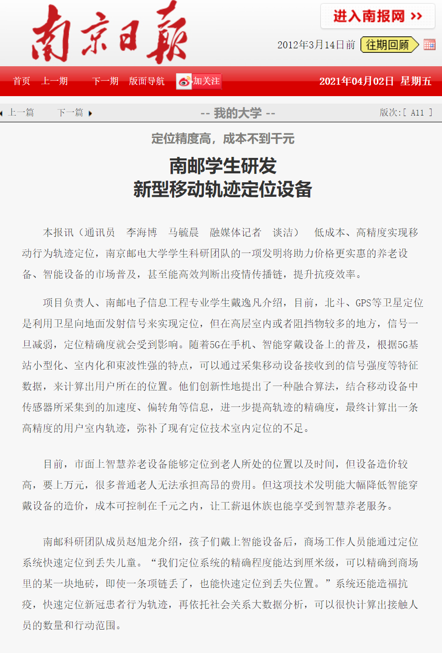 【南京日报】南邮学生研发新型移动轨迹定位设备