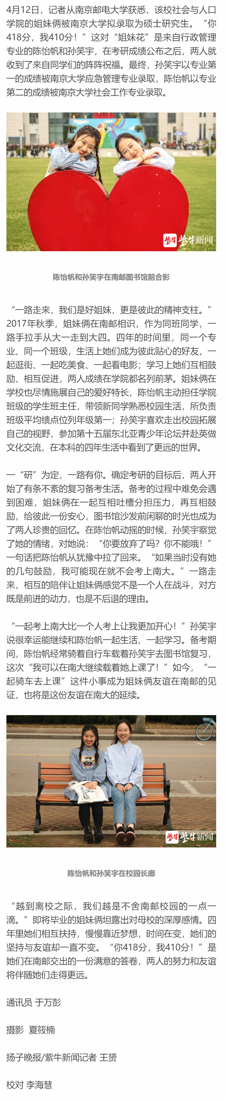 【扬子晚报客户端】“你418分,我410分”,来自学霸的友谊!南邮同班姐妹花考研同被南大录取