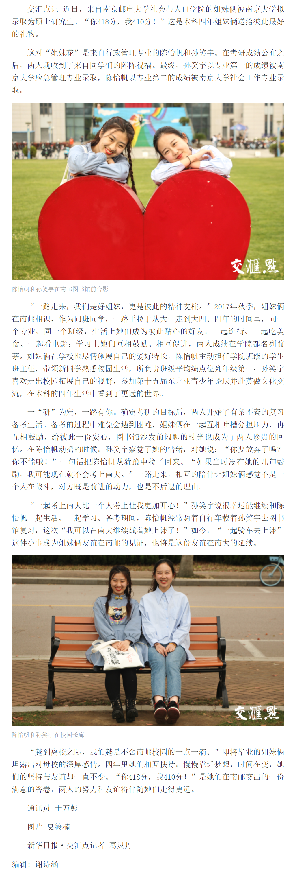 【新华日报客户端】神仙友谊!相约考研,南邮同班姐妹花双双被名校录取!
