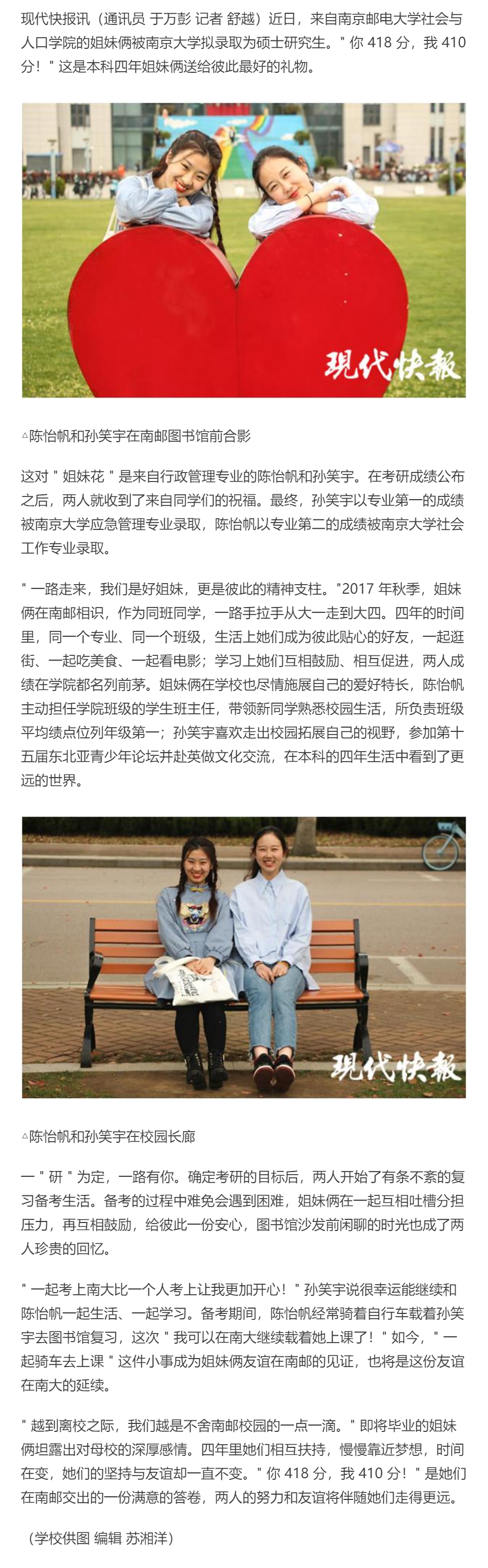 【现代快报全媒体】专业第一、第二!南邮姐妹花考研双双被名校录取