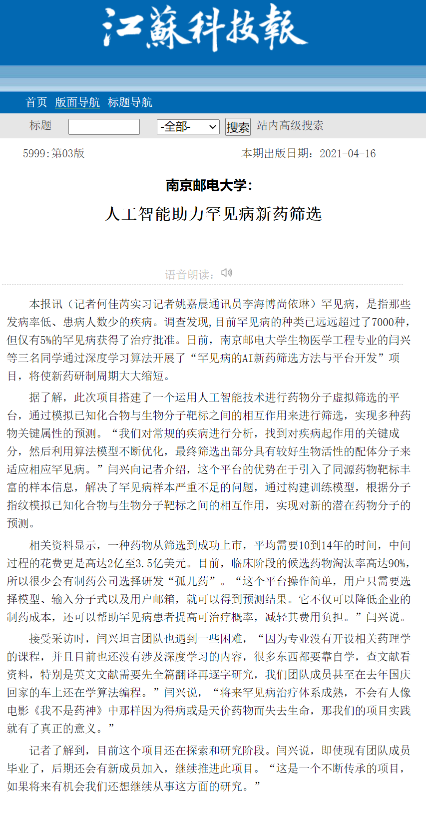 【江苏科技报】南京邮电大学:人工智能助力罕见病新药筛选